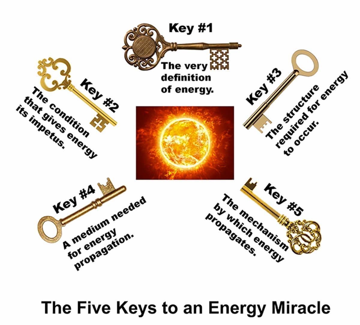 An examination of these 42 major discoveries revealed almost all of them had been based upon five fundamental principles. Chapter Six of the book introduces these Five Keys to the Energy Miracles, and details, simply and clearly, how it came to be that all five of them were abandoned in the mid 1930s, leaving us stuck with 19th-century energy sources.